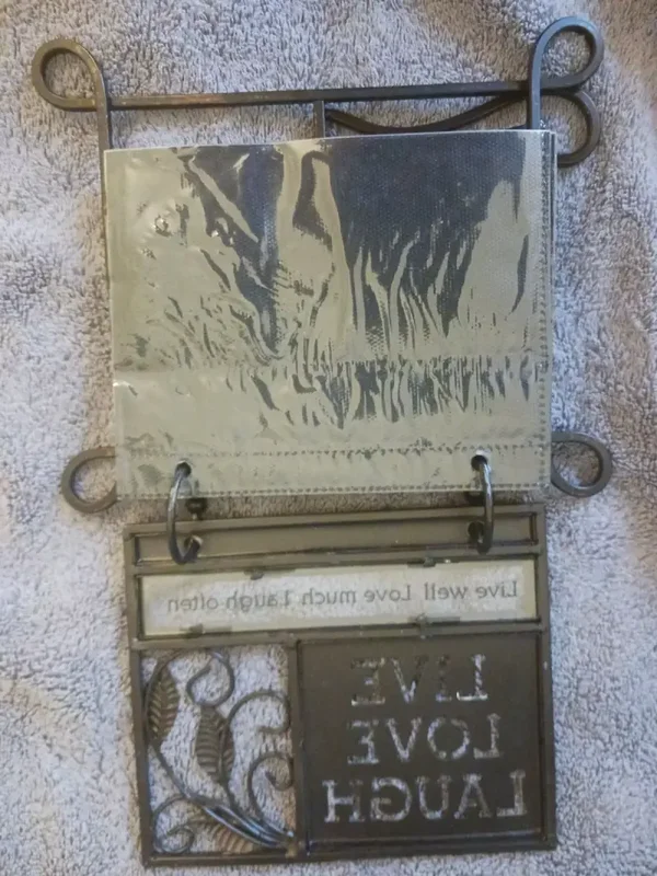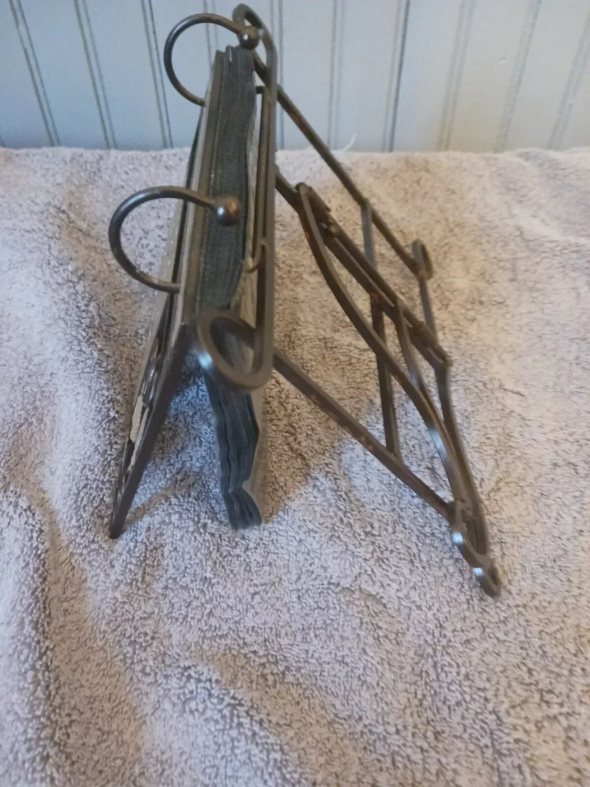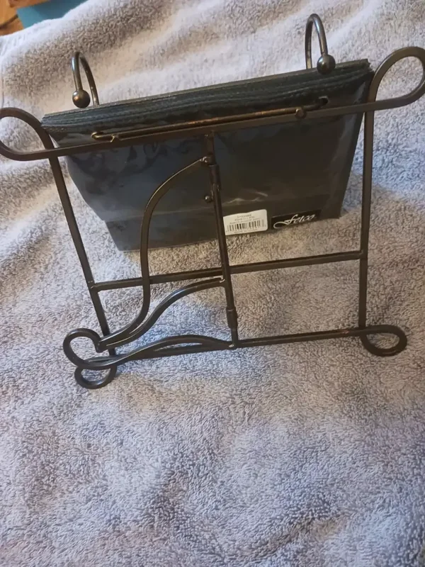 The product is a standing photo album made of distressed metal. It is designed to hold and display photos in a unique and stylish way. The distressed metal material adds a rustic and vintage touch to the album, making it a great addition to any home decor.